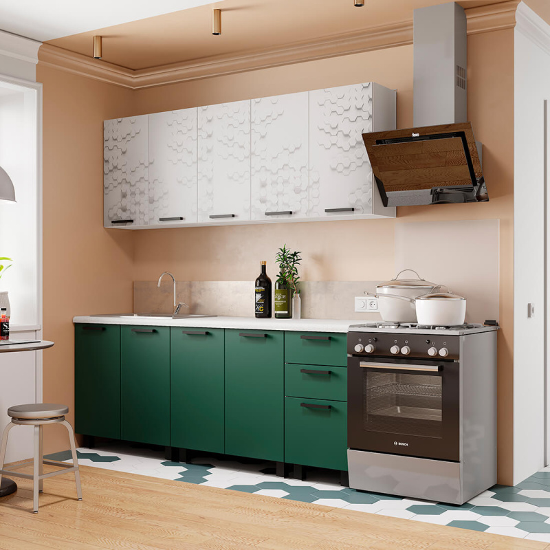 Фасады нижних модулей выполены в двух трендовых цветовых решениях - насыщенном зеленом цвете с текстурой soft-touch и абсолютно матовой поверхностью цвета тауп.