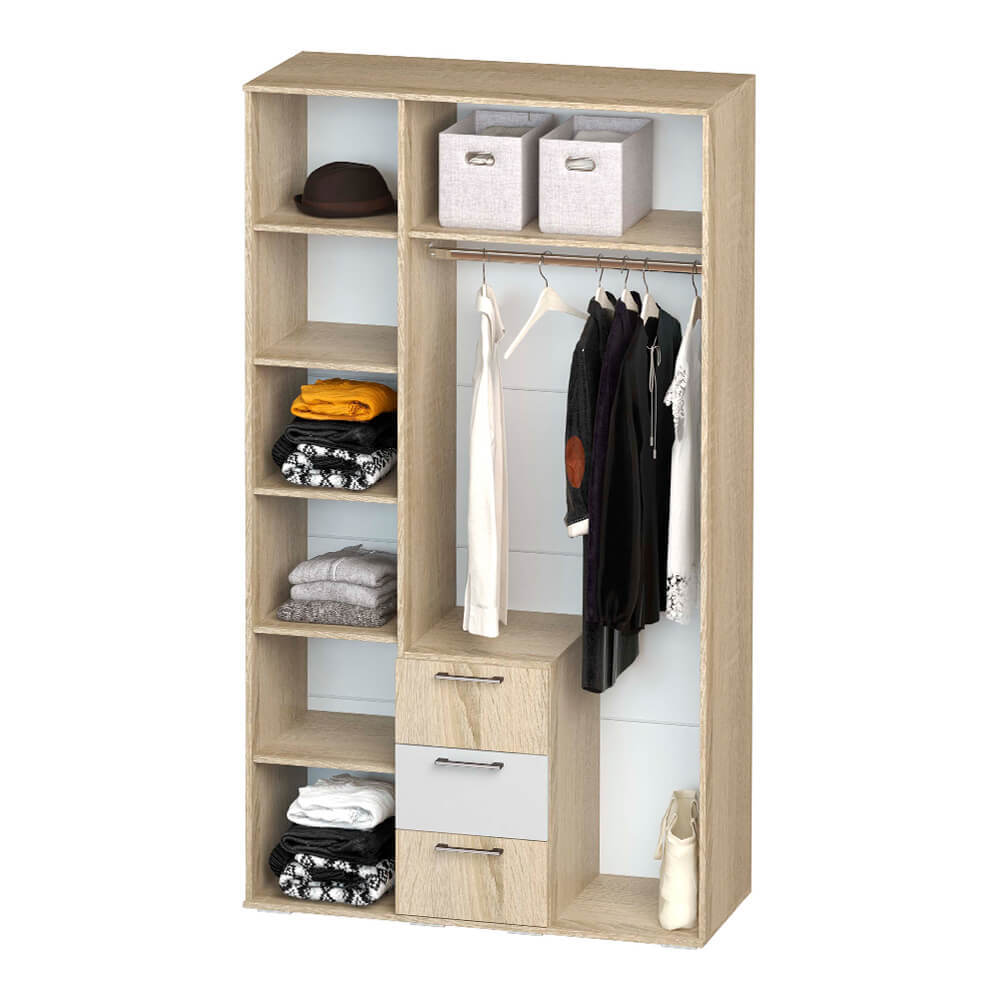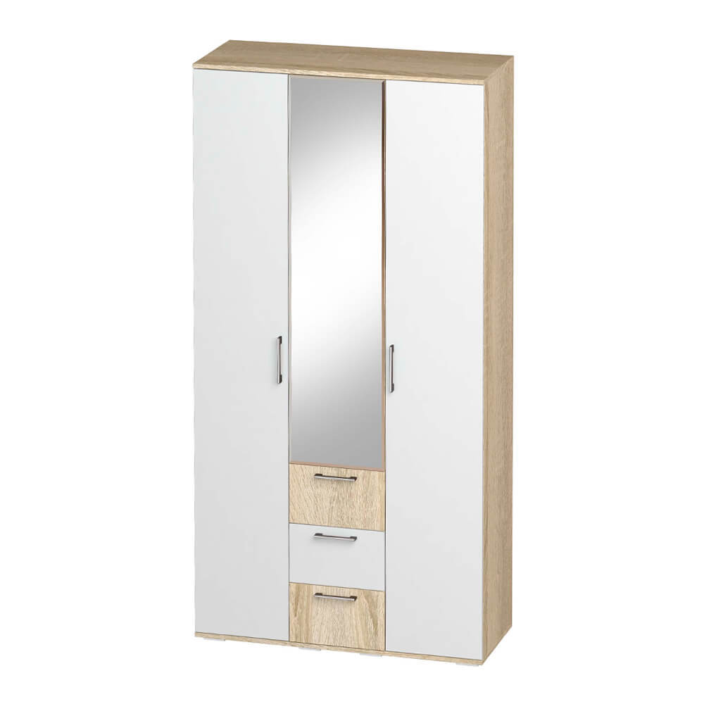 Большой вместительный трехстворчатый шкаф Белладжио поможет хранить большое количество вещей. Центральная створка у модели – зеркальная, под ней находятся три выкатных ящика. Внутренняя комплектация состоит из отделения с хромированной штангой и зоны с полками для хранения трикотажа или белья. Шкаф выполнен в комбинации цветов дуб сонома и белого глянца и прекрасно впишется в светлый современный интерьер. Высокое качество по доступной цене – это шкаф трёхстворчатый Белладжио ШК-14 в компании «Семья Мебелони».
