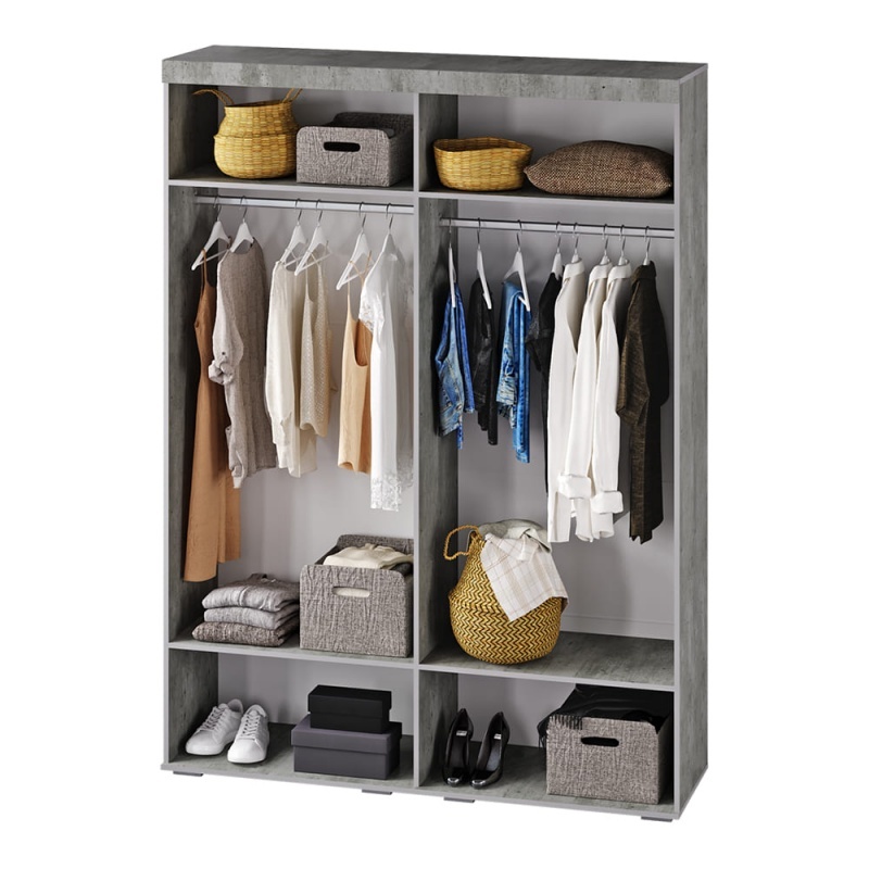 Внутреннее наполнение состоит из двух отделений со штангами, а также верхних и нижних полок для вещей. Стильный геометрические ручки украшают шкаф Инстайл