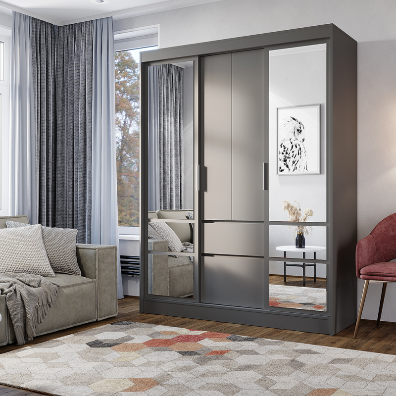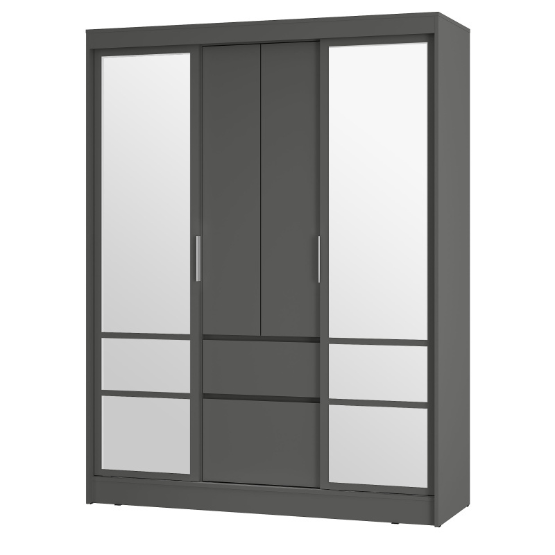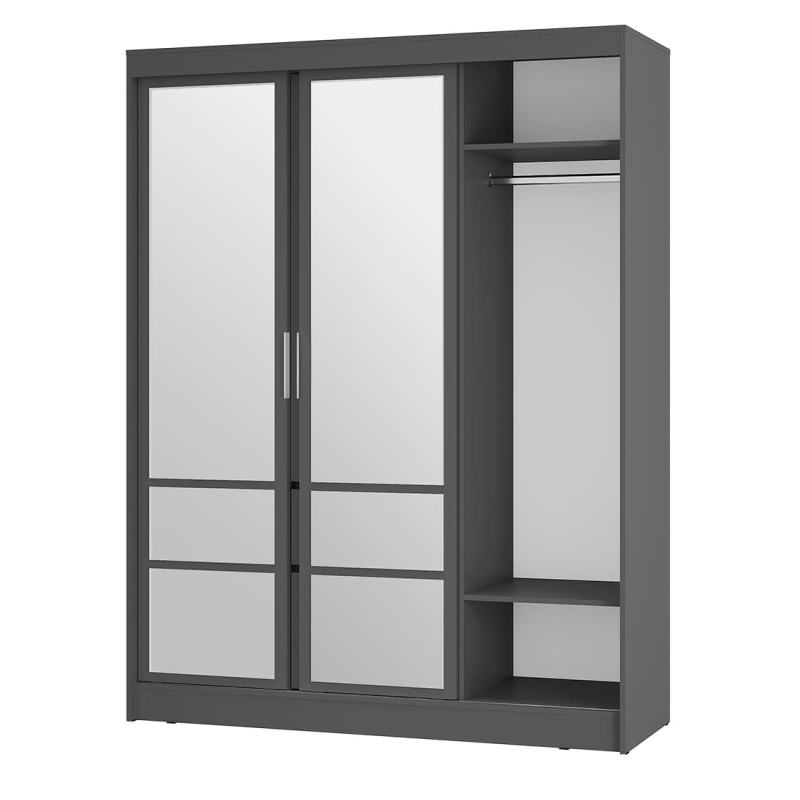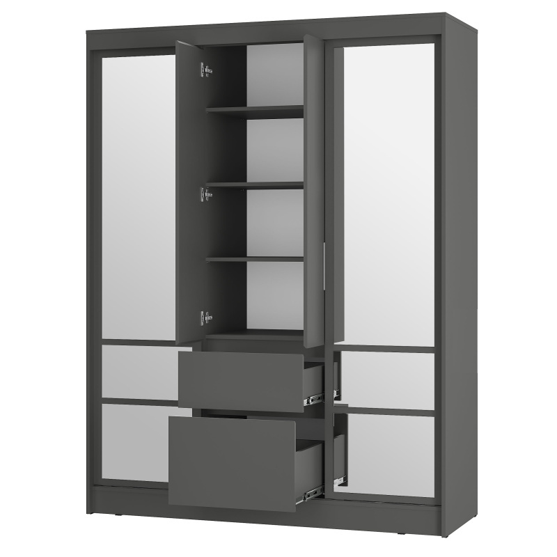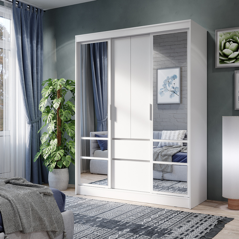 Шкаф-купе «Симпл» (ШКК-06) — вместительная и эстетичная модель для тех, кто предпочитает лаконичные интерьерные решения. Шкаф оснащен удобными ящиками и полками, а также пространством для вертикального хранения вещей. Вам не придется покупать большое зеркало, ведь фасад этой модели оснащен зеркалами с еврокромкой в комплекте, которые клеятся на фабрике. Направляющие у крайних створок СТ.
