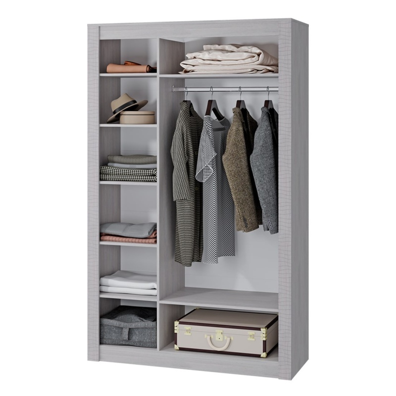 Трехстворчатый шкаф Монако относится к одноименной модульной серии. Модель не имеет вычурного декора и лишних деталей, выполнена в сдержанном и лаконичном стиле. Комплектация шкафа представляет собой несколько полок для хранения вещей в сложенном виде, а также отделение с хромированной штангой для одежды на вешалках.
