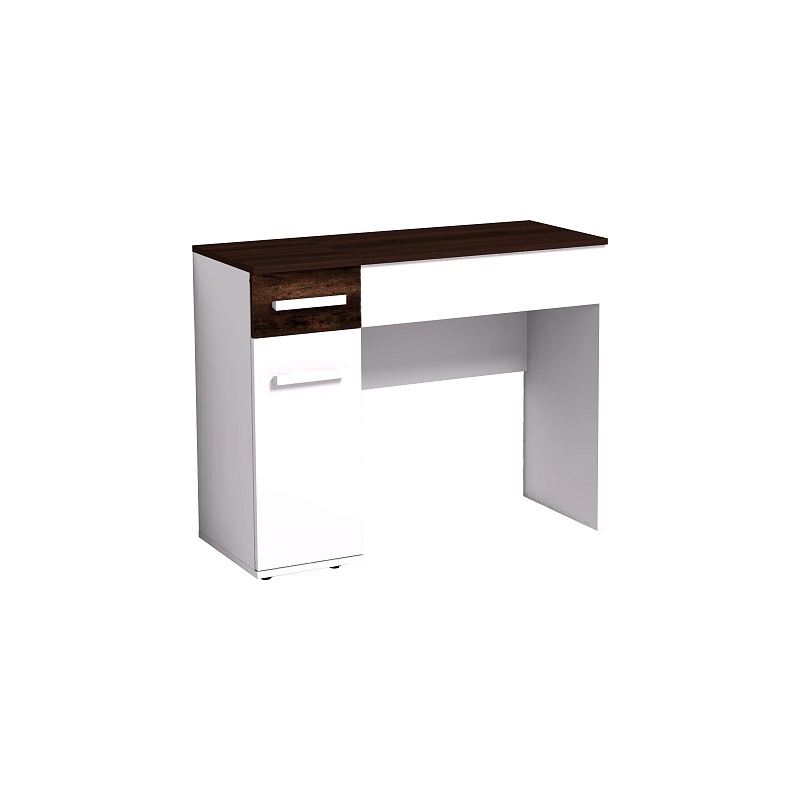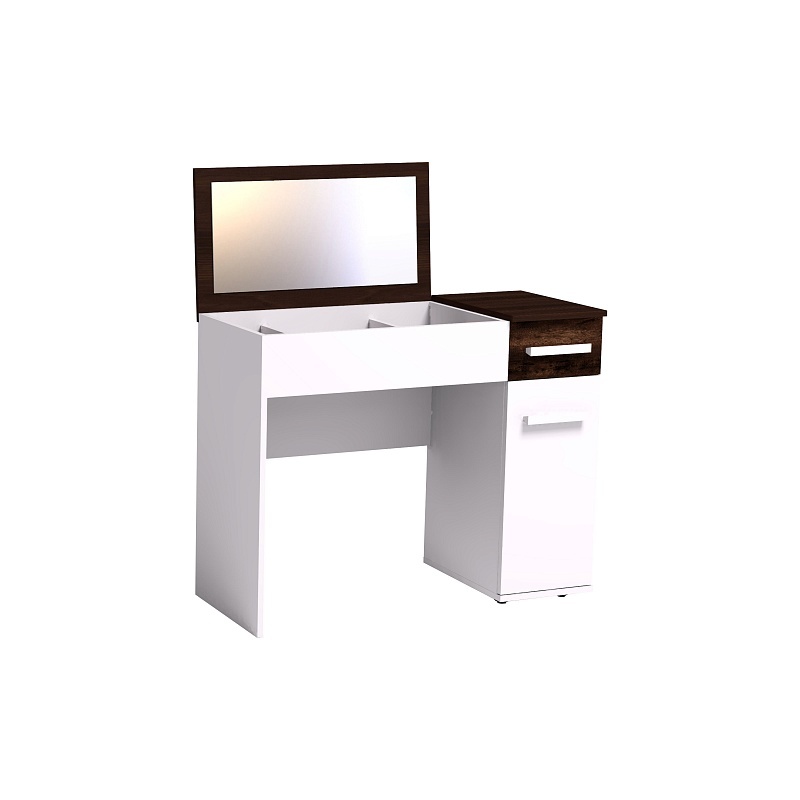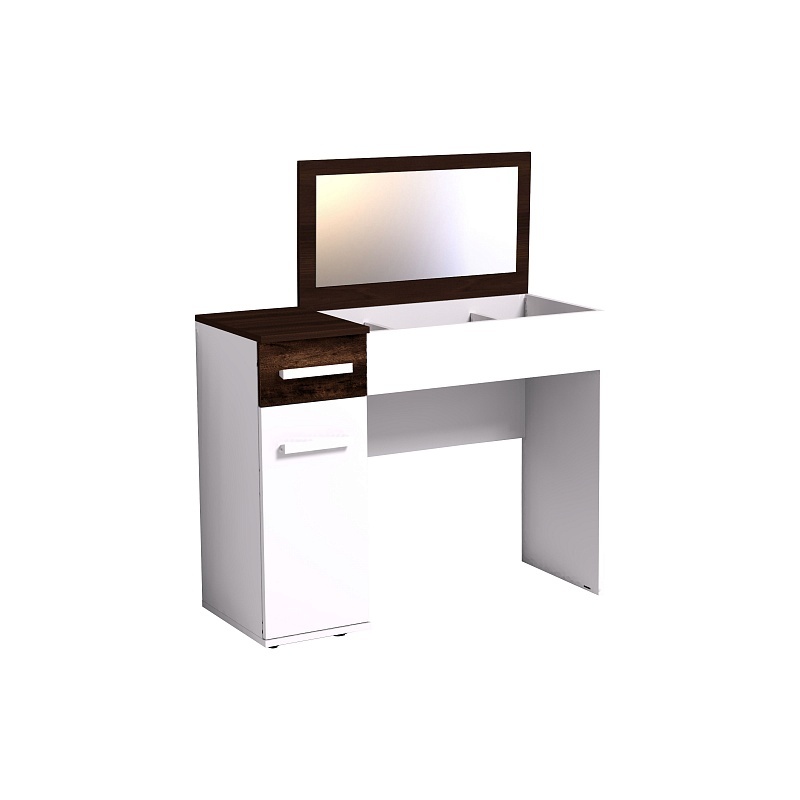 Туалетный столик из коллекции "Норвуд" оснащен откидной контрастной крышкой, которая скрывает нишу с органайзером для хранения мелких аксессуаров. На внутренней стороне крышки расположено зеркало. Сбоку предусмотрено отделение с полками за распашной дверцей и выдвижным ящиком. Конструкция предусматривает универсальную сборку.